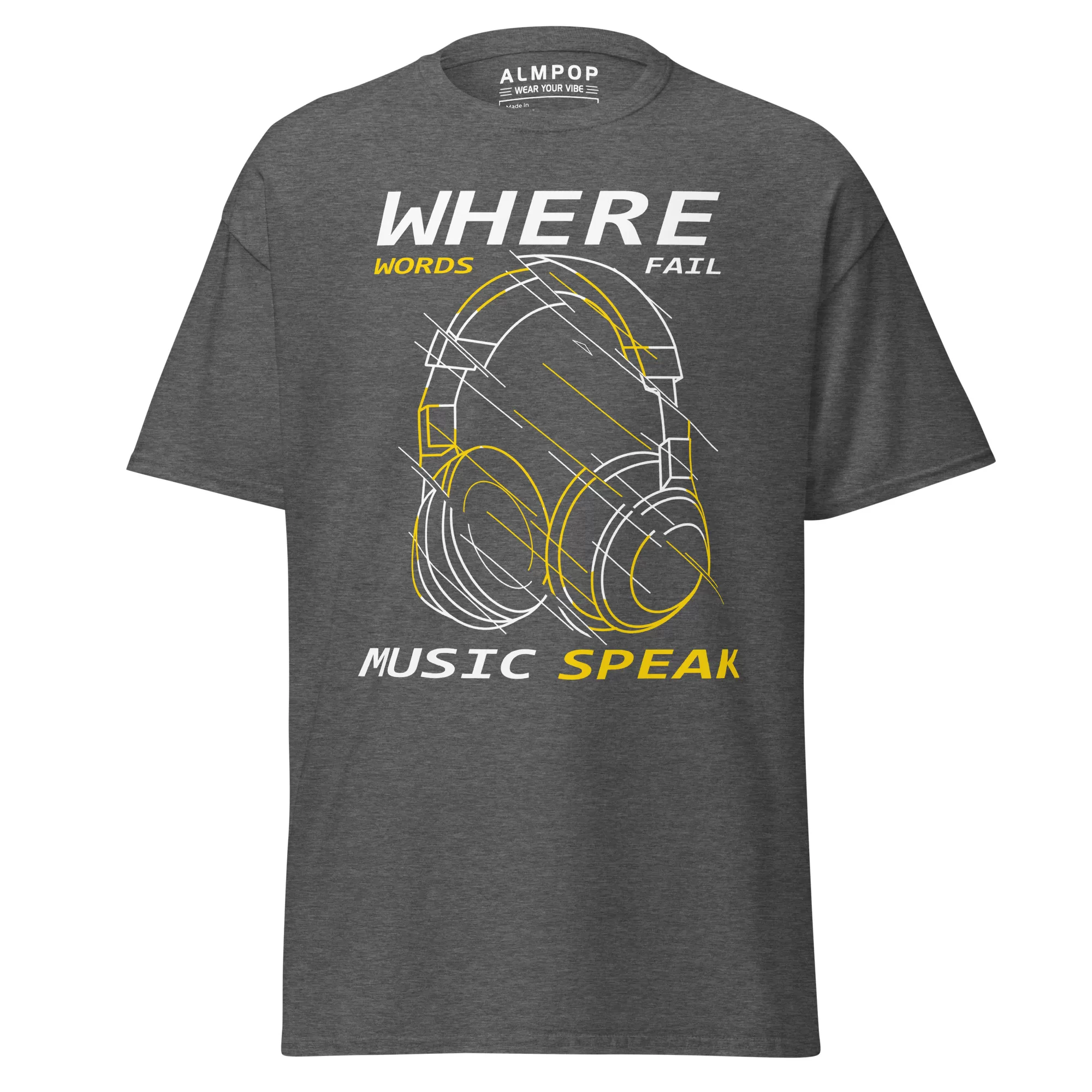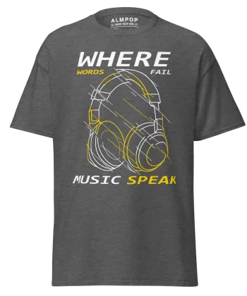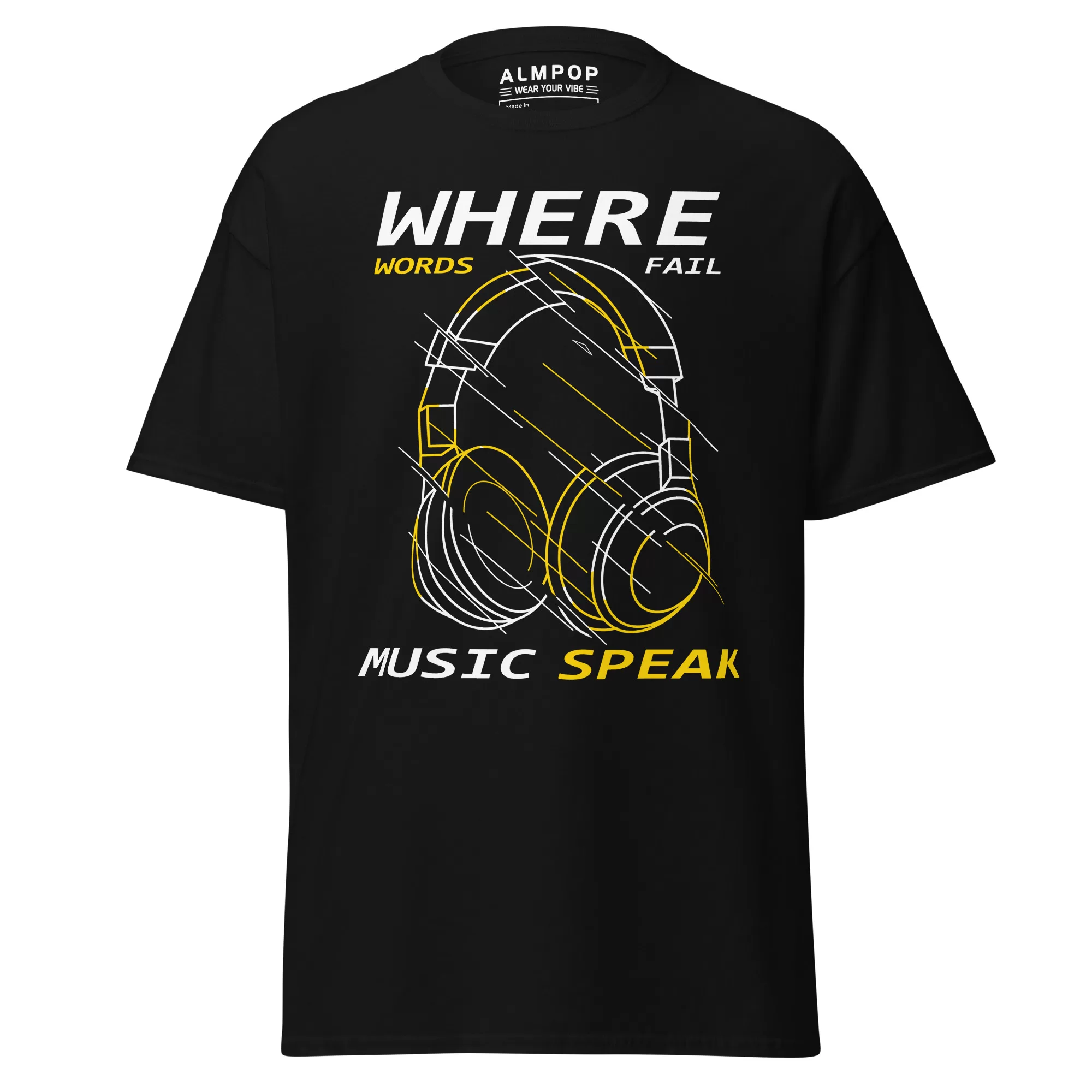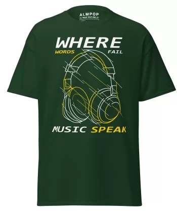 The front showcases a bold headphone graphic with geometric lines, combined with the inspiring phrase: “Where Words Fail, Music Speaks.” The design is modern, stylish, and perfect for DJs, musicians, and anyone who lives through music.
